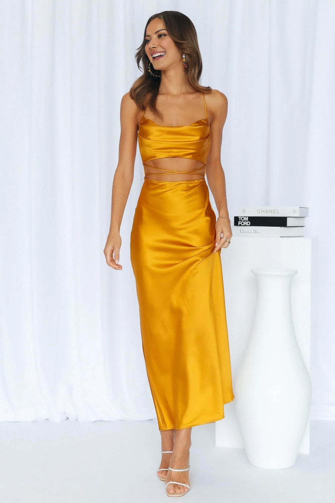 Be the hottest chick around with the Made Love Midi. Featuring a straight neckline with a lace-up back, midriff cut-out and a flowy long skirt. Style yours with mules and waves.