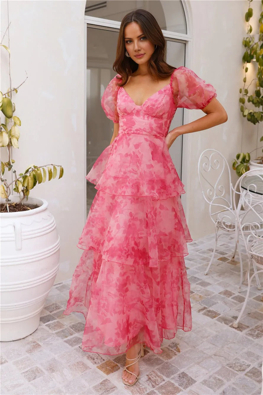 The Enchanted Castle Midi Dress features sheer puff sleeves, elasticated for comfort, a tiered frill design that creates a whimsical vibe complemented by a tie-up back for added allure. Perfect for special occasions, it blends sophistication and style.