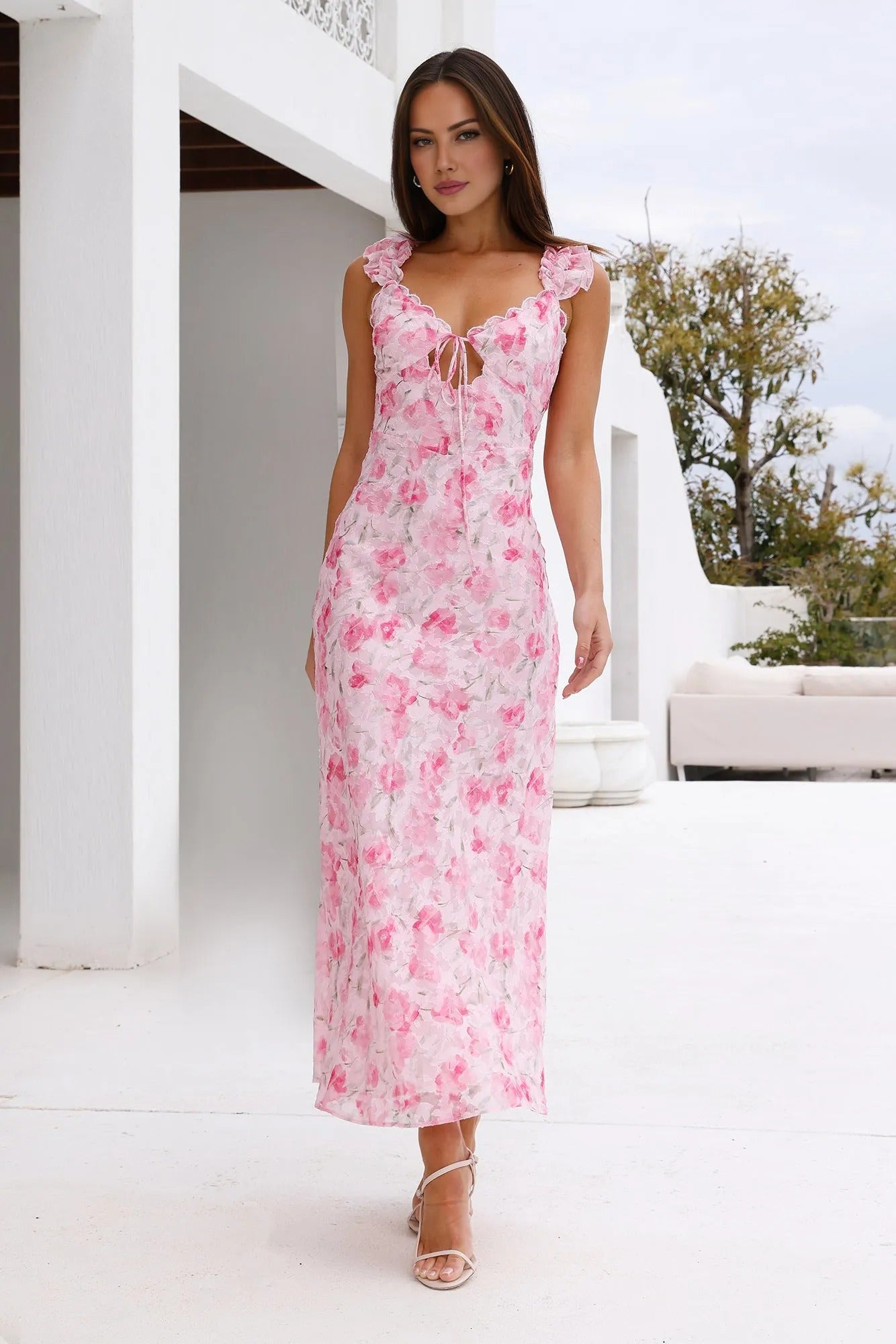 If you're looking for a dreamy dress, you've found it! The Rosé Midi Dress features elastic shoulder straps, a tie to the neckline and a gorgeous print. Style with heels and curls for a 'fit we love.