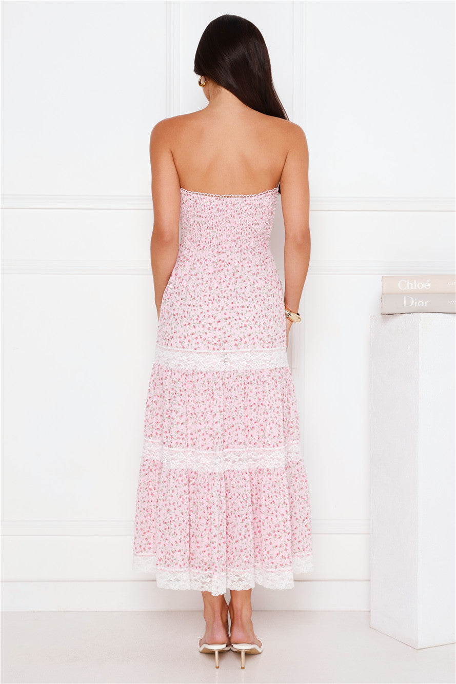 The vacay style you need to be seen in. The Under Palm Trees Strapless Midi Dress features a shirred elastic top, a flowy skirt with lace details and a gorgeous print. Style with sandals.