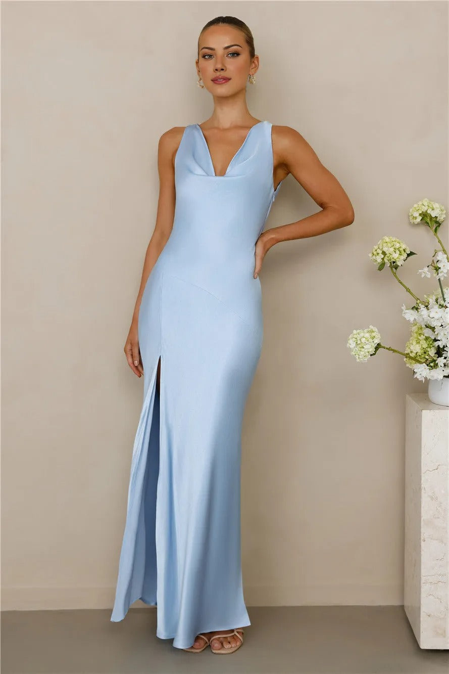 Embrace sophistication with a cowl neckline that cascades gracefully as well as a captivating cowl back. With a delicate tie to the back, this dress ensures a perfect fit while accentuating the silhouette. Its luxurious design promises to envelop your bridal party in timeless charm and sophistication, ensuring memories that last a lifetime.