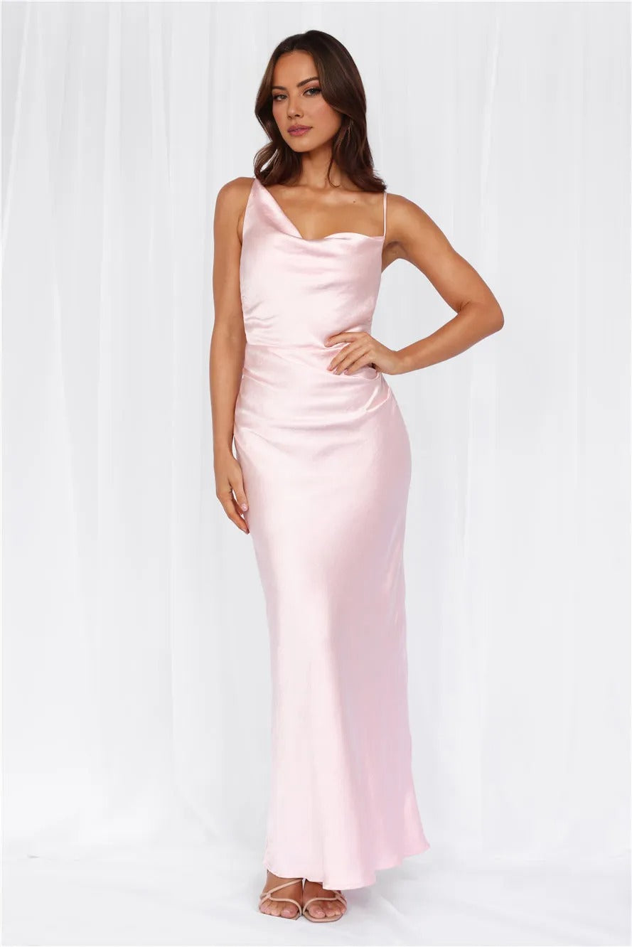 Embrace asymmetrical allure with a captivating cowl neckline that drapes gracefully, adding a touch of modern sophistication to the look. Adjustable shoulder straps ensure a perfect fit, while subtle gathered details to the sides of the top add delicate texture and dimension.
