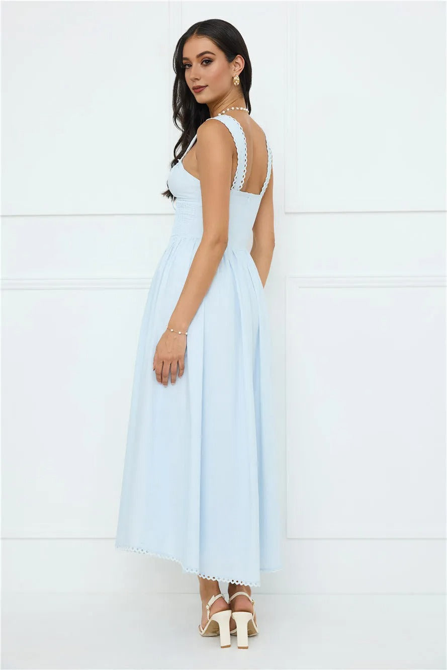 Love the look you're in with the Luxe Serene Midi Dress. It features a gorgeous embroidered trim to the shoulder straps, neckline and hem, a flowy skirt, a tie-up neckline and a pleated bodice. Style with heels.