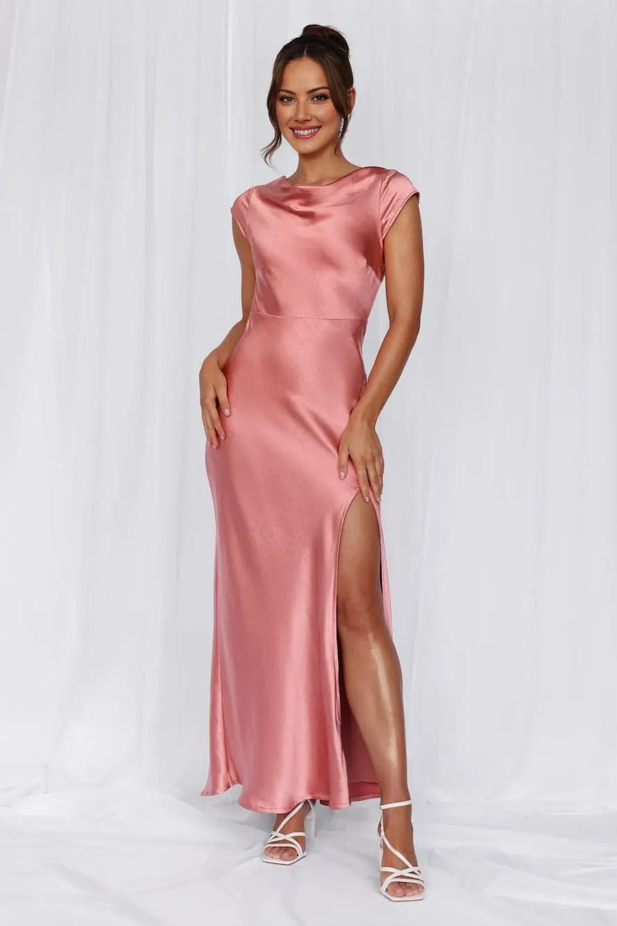 Introducing a captivating style, designed with a high cowl neckline and delicate cap sleeves, evoking timeless elegance and femininity. The tie-back feature adds a charming touch, while the twist back with a subtle cutout detail adds a modern flair, perfect for a bridesmaid ensemble that exudes both sophistication and contemporary style.